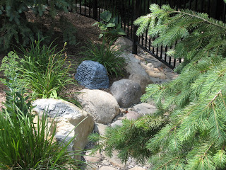 The audio company first suggested outdoor speakers mounted under the eave of the house. But to balance the sound out into the yard they installed “rock-speakers” in the landscape. Rock-speakers are offered in a few different styles and colors, and I assure you they sound better than they look:)